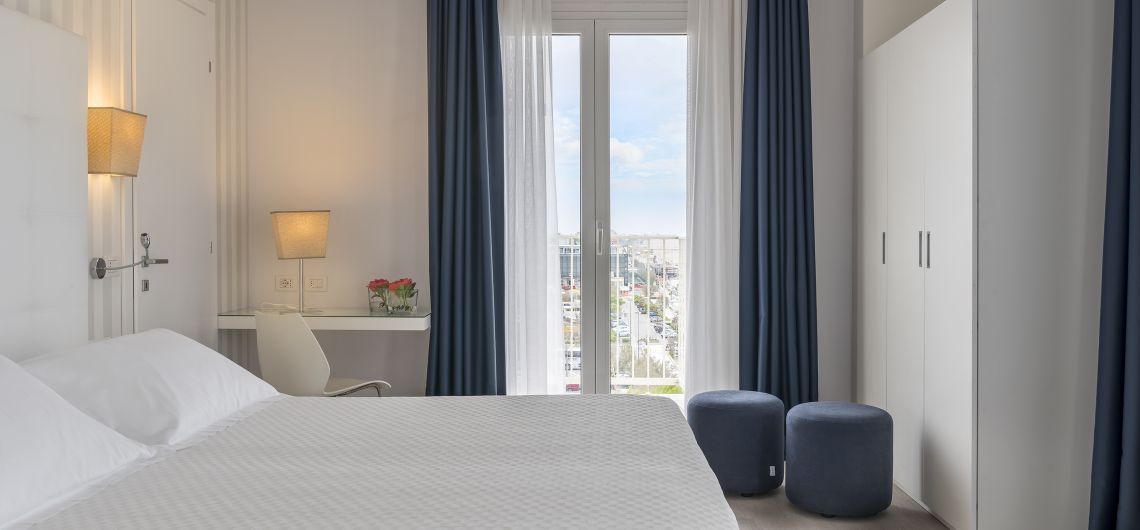 Verschiedene Zimmertypen, alle renovierte und schallisolierte Zimmer mit: Smart TV, Klimaanlage, Safe, Minibar, Badezimmer mit Dusche und Fön, alle mit Balkon mit Meerblick.